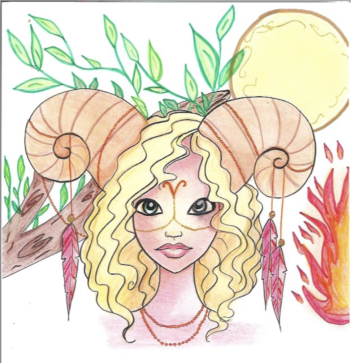 Avec son accord, voici ma mis en couleur du dessin de Laure Phelipon avec quelques éléments rajoutés pour évoquer la saison que ce signe « ouvre » (le printemps) et son élément, le feu.