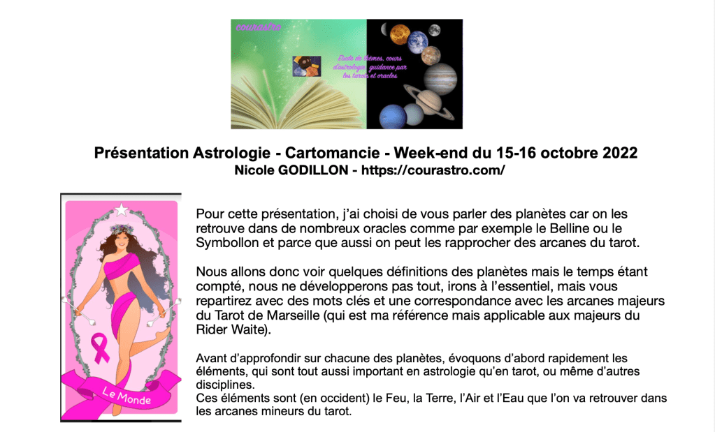 présentation des planètes et leur reliance aux lames majeures du Tarot de Marseille (conférence NG le monde en rose)